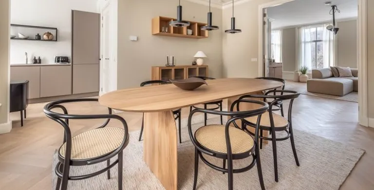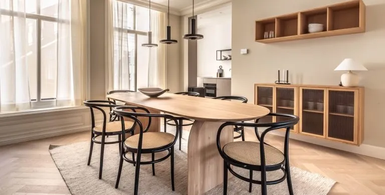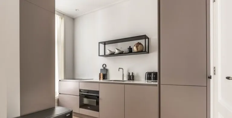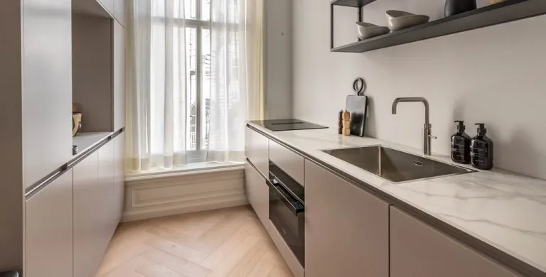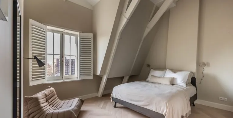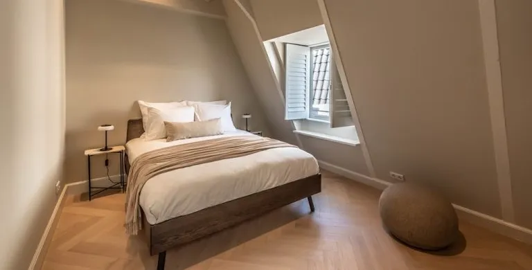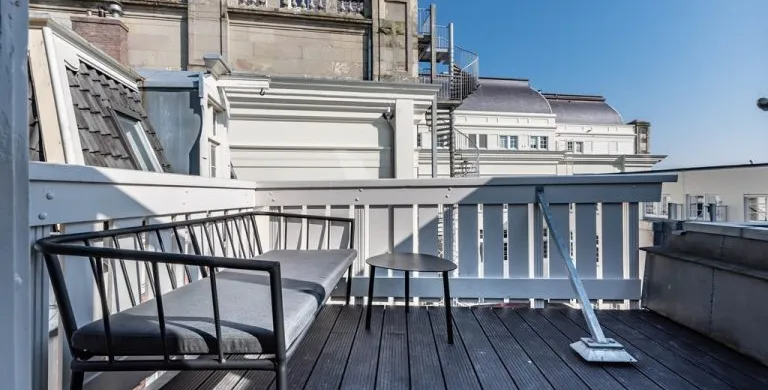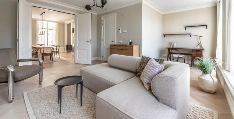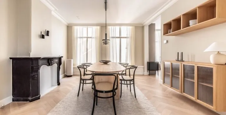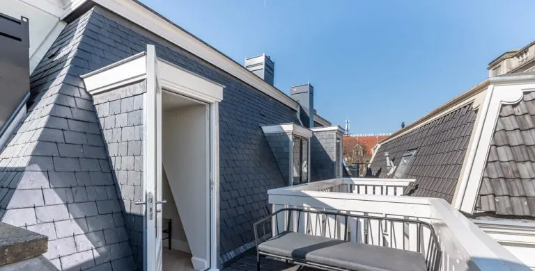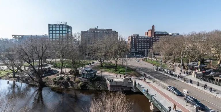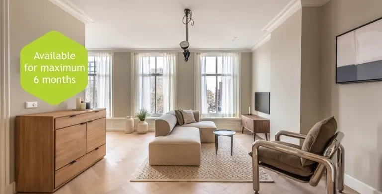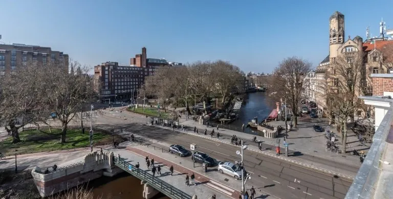 . Description. We proudly present these renovated, newly furnished, and styled turn-key apartments in a monumental canal house at Leidsekade.. During the renovation of this building, conscious choices were made for sustainable redevelopment on the one hand and the preservation of the original architectural aspects on the other, achieving a highly luxurious standard. All apartments are furnished with high-end design furniture and equipped with high-speed internet, a water purification installation, a high-quality ventilation system, and have an A+ energy rating. All apartments come with mandatory bi-weekly cleaning.. Layout. Entering on street level, you can already breathe in the history of this building, situated just a footstep away from Vondelpark and Leidseplein.. Take the stairs up to the third floor to enter apartment B. Once you set foot in the hall of the apartment, you instantly sense this can be a place to feel at home. The hallway gives access to the living room, and a separate toilet.. From the hallway, you enter the living room which is situated on the front side of the apartment. It is a bright and airy living room with large windows, offering plenty of natural light and breathtaking views of the canal. Sitting on the comfortable couch here, you may never want to leave this calming room again.. In the dining area, you will find a nice dining table with six comfortable chairs. Next to the table, you can access the elegant kitchen equipped with a microwave/steam oven, Quooker, refrigerator, dishwasher, coffee machine, toaster, and plenty of storage space.. Walking up the stairs, you will find the master bedroom with a comfortable bed where you can have a good night’s sleep. The built-in closet contains plenty of storage for your wardrobe.. Next to the master bedroom is the second bedroom, which also has a comfortable bed and a built-in closet. The master bedroom and the second bedroom each have an en suite bathroom. The bathrooms have a modern washbasin with cabinet, a modern shower, a toilet, and a towel heater. Both bathrooms are decorated with beautiful marble tiles.. Through the hallway, you can access the roof terrace where you can enjoy the sun.. A beautiful herringbone wooden floor, dimmable built-in lights, and elegant doors with matching door fittings can be found throughout the entire apartment, giving it an overall lush and warm feel.. Location. Quietly yet very centrally located on one of the most beautiful canals in Amsterdam; the Singel canal. Located in the UNESCO-designated canal area. The house is located between the ever-popular Leidseplein and the famous and beautiful Vondelpark. An environment with an extensive range of art, culture, and a wide range of specialty and delicatessen shops within walking distance. Many residents experience living in this area as an ideal mix of dynamism, tranquility, and village character.. Accessibility. Accessible by public transport by tram on Leidseplein and within walking distance of metro station Rokin and Vijzelgracht. The North-South line has an optimal connection with, among other things, the South Axis and Central Station. Public parking on the street. A short waiting list for a parking permit. Parking in the adjacent Hirsch building may be available on request or otherwise in the Q-Park parking on the other side of the canal.. Viewings by appointment, please e-mail our office.. Are you relocating to The Netherlands? Urban Homies can assist you and your employees. Visit our website for more information.. +. -.