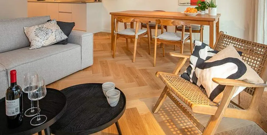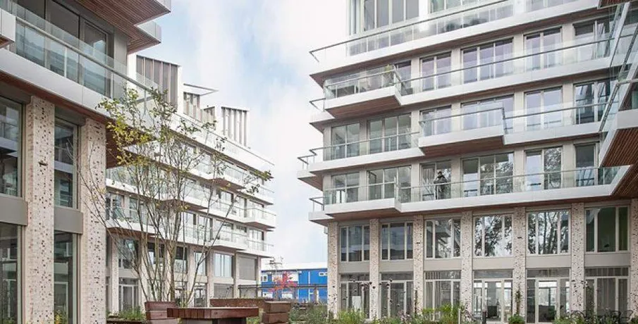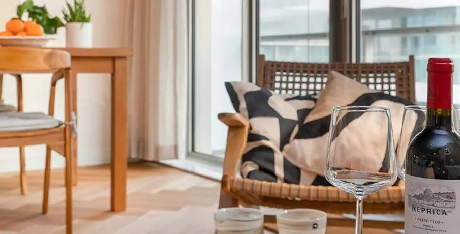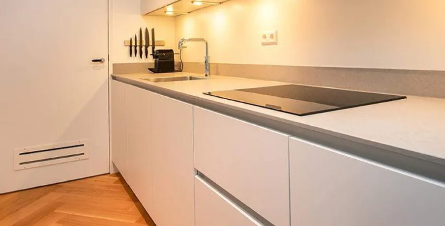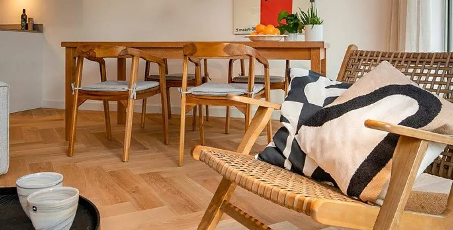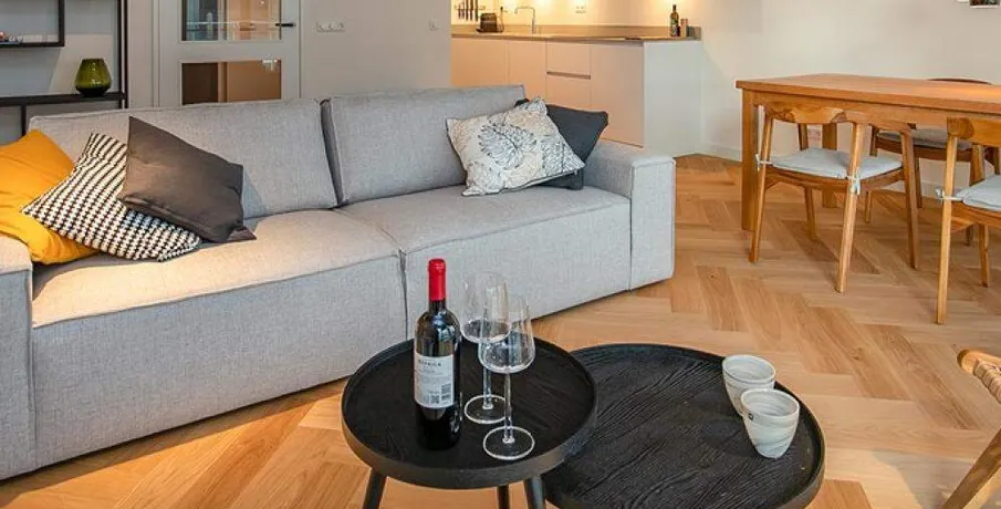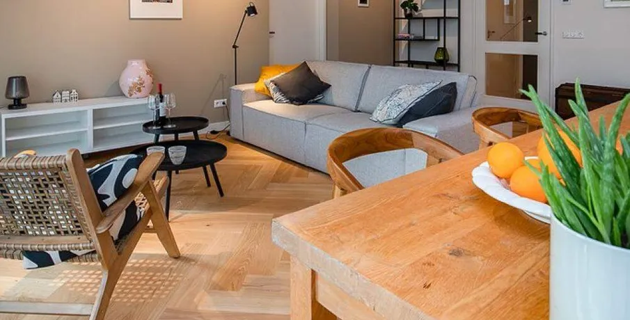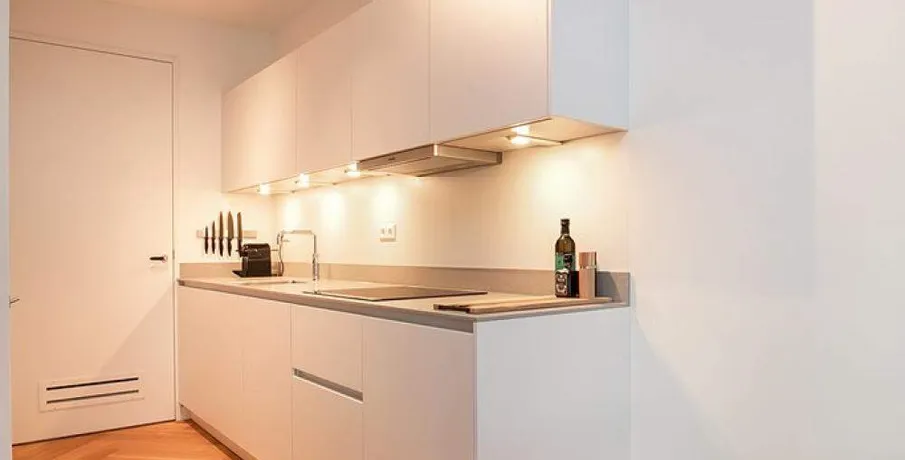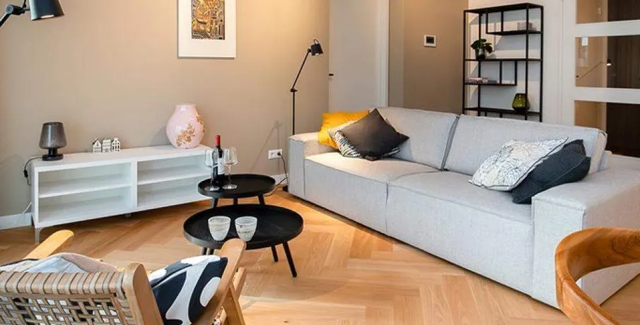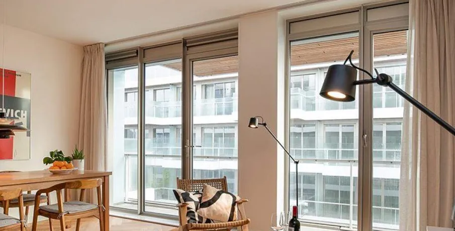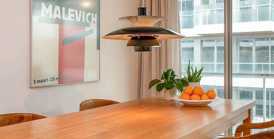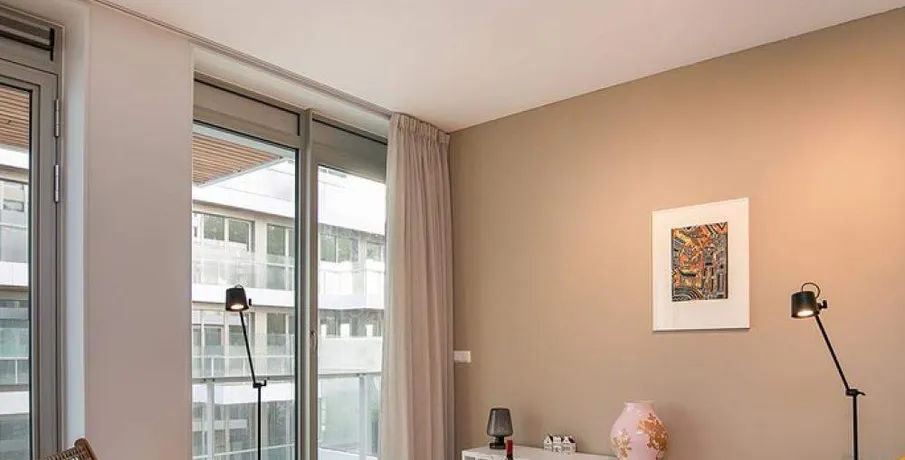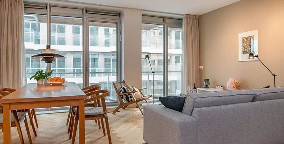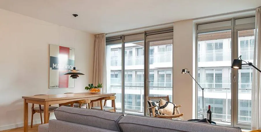 Luxurious and fully furnished 1-bedroom apartment (65sqm) located in the newly developed area ‘Cruquius’, on the east side of the center of Amsterdam.. The apartment has energy label A.. Layout:. Communal entrance on the street level, elevator or staircase to the apartment.. Third floor:. Private entrance, hallway with hanging space for coats and separate toilet with fountain.. The open plan living area has a lot of natural daylight due to the floor to ceiling windows and access doors to the balcony. All the quality furniture has been carefully selected and gives the apartment a warm, luxurious feeling.. The modern kitchen is situated at the side of the living area and is fully equipped with built-in appliances such as a large refrigerator, freezer, dishwasher, induction stove, Quooker and combination oven/microwave.. There is a separate laundry area with washing machine and dryer + pantry can be reached through the kitchen.. The spacious bedroom is equipped with a comfortable double bed, large wardrobe and desk.. From the bedroom you can access the modern bathroom with walk-in shower and washbasin.. The large balcony is facing East (morning sun!) and has a view over the communal garden and the water on the left.. The entire apartment has an oak wooden floor with heating- and cooling function, the windows have triple glass and solar panels are installed on the building.. The building is extremely energy sufficient.. Furthermore, there is a large private storage space and a communal bike storage in the basement level.. Location:. Cruquius is a newly developed residential area, located on the east side of Amsterdam. You can reach the city center within a 10-minute bicycle ride.. The large shopping center ‘Brazilie’ is situated within walking distance (17 min) or bicycle distance (4 min). It offers multiple supermarkets, but also a fish store, a butcher, a wine store and flower- and drugstores.. Furthermore, there is a biological farmers market around the corner that is open every Wednesday.. There are multiple tram- and bus connections into the city center and/or central station.. The Ring A-10 can be reached within a few minutes by car.
