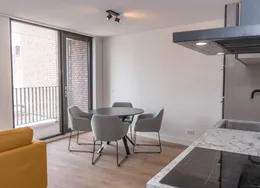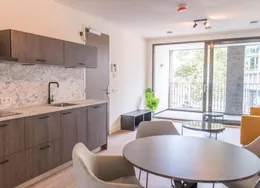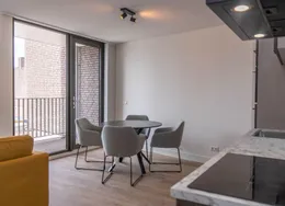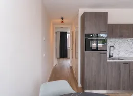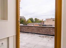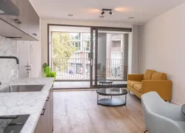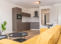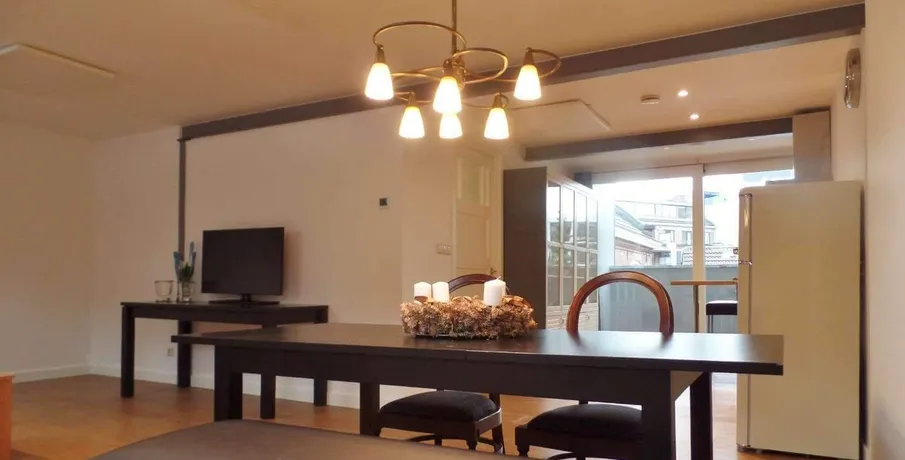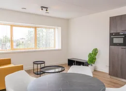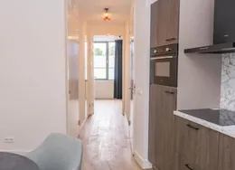DescriptionNewly delivered, attractive, fully furnished apartment on the 1st and 2nd floor in the bustling center of Tilburg (Tivoli). To be able to live here, you only need to bring your suitcase. The apartment is very centrally and yet quietly located on a beautiful street in the vicinity of shops, supermarket, cozy restaurants, Poppodium 013, public transport and roads.. Layout:. Communal entrance with stairs to the 1st floor.. 1st floor:. Entrance hall with access to all rooms on the 1st floor, staircase to 2nd floor and wardrobes. Then you will find a spacious living room with lots of light through the large skylights. From the living room you reach the open kitchen with sliding doors to a spacious balcony. The kitchen is equipped with various luxury appliances, such as an extractor hood, a hob, a dishwasher, a combination oven-microwave and a sink. The kitchen is also equipped with a large fridge freezer and a bar with two bar stools for a delicious breakfast in the morning. From the hall you reach the luxurious bathroom with toilet, washbasin and large walk-in shower.. 2nd floor:. Landing with space for a guest bed and velux skylight, spacious bedroom with velux skylight.. Particularities:. All rooms in the apartment have a beautiful laminate floor.. Heating by means of comfortable energy-efficient infrared heating panels.. There are plenty of parking options with a parking permit in the area and it is also possible to rent a private parking space..