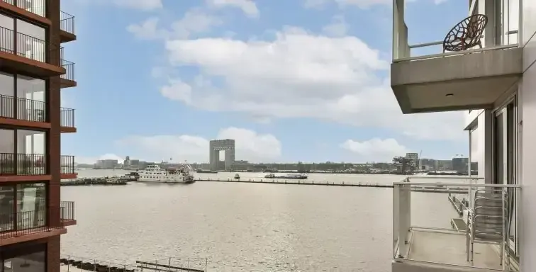 Omschrijving. – PLEASE FILL IN THE VIEWING REQUEST FORM TO PLAN A VIEWING, CALLS WIL NOT BE SCHEDULED!! –. Located on the second floor with views over the IJ River towards Pontsteiger and Centraal Station, this recently build (2024) apartment with an A+++ label is ready to move in.. A fantastic apartment in a prime location on the IJ River!. The apartment features a PVC herringbone floor and equipped with a modern kitchen, bathroom, and toilet.. Heating and cooling are provided by a heat recovery and thermal energy storage system combined with underfloor heating, making it incredibly comfortable.. Location. The NDSM site is known as a fantastic cultural hotspot where art and creativity converge.. You’ll find a wide variety of dining options there, such as Pllek, IJver, the IJ-kantine and Loetje aan ’t IJ.. For daily groceries, you can visit Albert Heijn, bakery Bbrood, Hema, and various other shops.. By car, you can reach the A10 ring road in just a few minutes. Public transport is well-organized. The NDSM ferry docks practically right outside the door and takes you to Amsterdam Central Station in 15 minutes and to the Pontsteiger in 5 minutes. The nearest bus stop is a few minutes’ walk away.. Layout. Second floor: hall/entrance with meter cupboard and utility room, toilet with basin featuring modern tiling, bathroom with built-in shower and double sink.. Lovely bright living room with access to the spacious balcony. The views from the living room, bedroom, and balcony are magnificent. The open-plan kitchen features high-quality built-in appliances.. The living room has floor-to-ceiling windows that provide access to the balcony, perfect for enjoying the sun while overlooking the IJ River.. The bedroom with a view is situated next to the living room.. Details:. – Rental price €2.350,- excl. per month. – Living area approx. 66m² (not measured according NEN 2580). – Available directly for a minimum period of 12 months (model C). – 2 months deposit. – Fully furnished. – Energy label: A+++. – 1 bedroom. – Not suitable to share. – No pets, no smoking. – Subject to landlord approval. – Income requirement: at least 3 times the monthly rent gross. **This Property is listed by JLG Real Estate a MVA Certified Expat Broker**. DISCLAIMER. This information has been compiled by us with the necessary care. On our part, however, no liability is accepted for any incompleteness, inaccuracy or otherwise, or its consequences. All sizes and dimensions are indicative.. .
