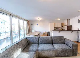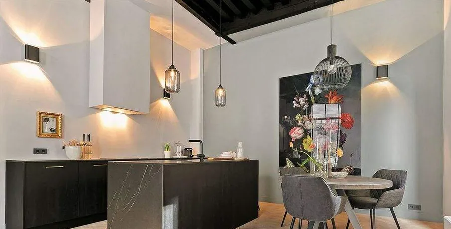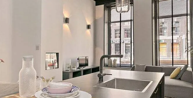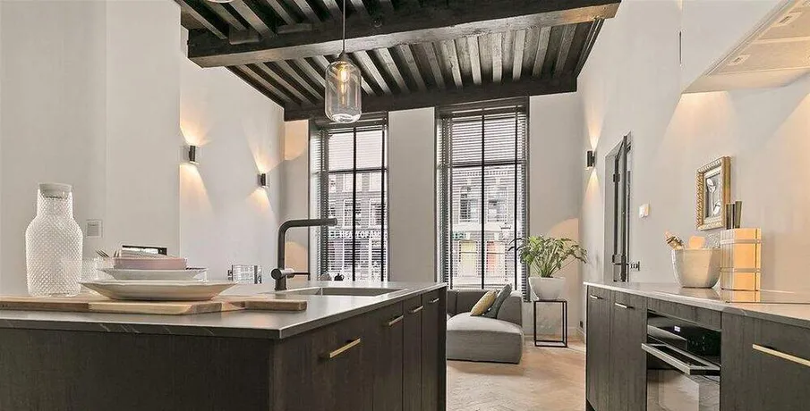 . Beschrijving. *English below*. Hoogwaardig gerenoveerd en gemeubileerd drie kamer appartement van ca. 90 m2 in een 17e-eeuws grachtenpand aan de Oudezijds Achterburgwal. Gelegen in het Wallen gebied, het oudste deel van het centrum van Amsterdam. Het appartement maakte vroeger deel uit van het voormalige "Bethaniënklooster" (1460) en is in 1624 in zijn huidige staat herbouwd. Het appartement ligt op de hoek van de Oudezijds Achterburgwal en de Koestraat en is te bereiken via een eigen ingang op de bel etage.. De woonkamer heeft een indrukwekkend 4 meter hoog houten plafond wat zorgt voor een zeer veel licht en een ruimtelijk gevoel. Twee grote ramen met uitzicht op de gracht en een groot raam met uitzicht op de rustigere Koestraat. In de woonkamer bevindt zich een zwart-marmeren open keuken voorzien van een luxe kookeiland met alle benodigde keukenapparatuur. De stijlvol ingerichte woonkamer met een elektrische openhaard geeft een knus en privé gevoel terwijl u zich in het midden van de stad bevindt. De gang, die bereikbaar is via de moderne glazen / stalen deur, bevat een grote kledingkast en een ruim en apart toilet.. Beneden betreedt u de benedenverdieping met veel ramen. Via een ruime hal zijn de twee slaapkamers, de badkamer en de berging te bereiken. De schuifdeuren zorgen voor een ruimtelijk en licht gevoel. De grote slaapkamer heeft een tweepersoonsbed en een zeer grote kledingkast. De kleinere slaapkamer heeft een slaapbank en kan ook worden gebruikt als kantoor. Alle kamers hebben dubbel glas en hebben hun eigen ventilatiesysteem. Mooi afgewerkte badkamer met regendouche, wastafel en handdoekenradiator. In de gang op de begane grond vindt u een speciale kast waarin de wasmachine / droger netjes zijn weggewerkt.. Bijzonderheden:. Compleet gerenoveerd. Gemeubileerd. Beschikbaar per 1 mei 2021. Geen makelaarskosten. Deze vrijblijvende informatie is door ons kantoor met de meeste zorg samengesteld aan de hand van de door de verhuurder aan ons ter hand gestelde gegevens en tekeningen. Derhalve kunnen wij geen garanties verstrekken, noch kunnen wij op enigerlei wijze eventuele aansprakelijkheid voor deze gegevens aanvaarden.. *English*. High quality renovated and furnished two bedroom apartment of approx. 90 square meters in a 17th century canal house on the Oudezijds Achterburgwal. Located in the Red Light District, the oldest part of the center of Amsterdam. The apartment used to be part of the former "Bethaniënklooster" (1460) and was rebuilt in its present state in 1624. The apartment is situated on the corner of Oudezijds Achterburgwal and Koestraat and can be reached via a private entrance on the ground floor.. The living room has an impressive 4 meter high wooden ceiling which provides a lot of light and a spacious feeling. Two large windows overlooking the canal and a large window overlooking the more quiet Koestraat. In the living room you will find a black-marble open kitchen with a kitchen island and all necessary kitchen appliances. The stylishly furnished living room with an electric fireplace gives a cozy and private feeling while you are in the middle of the city. The corridor, which is accessible via the modern glass / steel door, contains a large wardrobe and a spacious and separate toilet.. Downstairs you enter the ground floor with many windows. Through a spacious hall you can reach the two bedrooms, the bathroom and the storage room. The sliding doors provide a spacious and light feeling. The large bedroom has a double bed and a very large wardrobe. The smaller bedroom has a sofa bed and can also be used as an office. All rooms have double glazing and have their own ventilation system. Beautifully finished bathroom with rain shower, sink and towel radiator. In the hallway on the ground floor you will find a special cupboard in which the washer and dryer are neatly concealed.. Features:. Completely renovated. Furnished. Available from May 1st 2021. No brokerage fees. This information is composed by our office with the utmost care on basis of the data and drawings provided to us by the landlord. Therefore, we can not provide any guarantees, nor can we accept any liability for these data in any way..