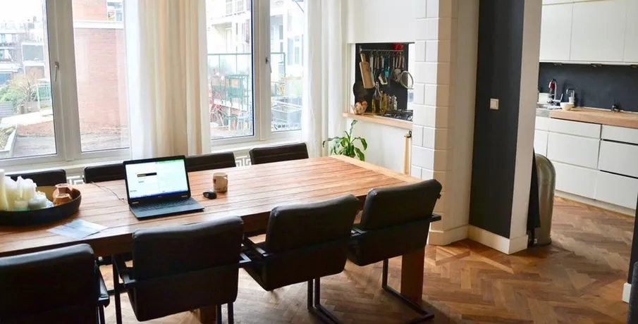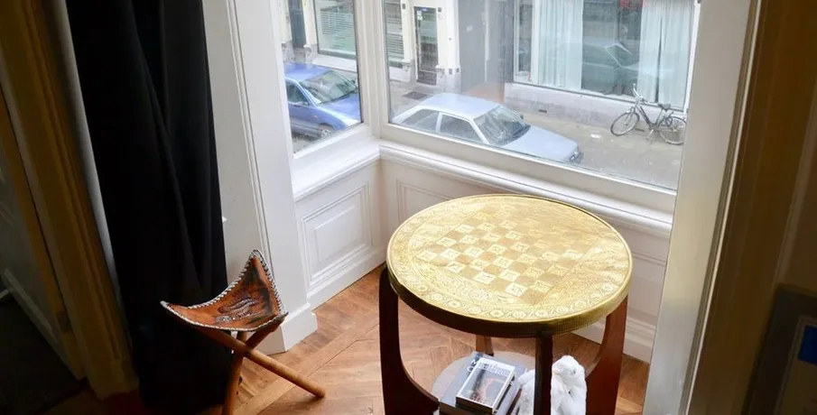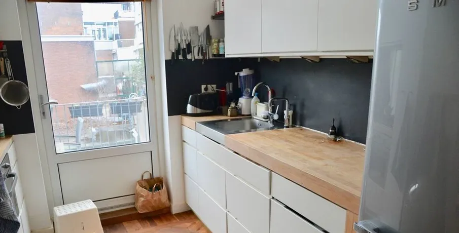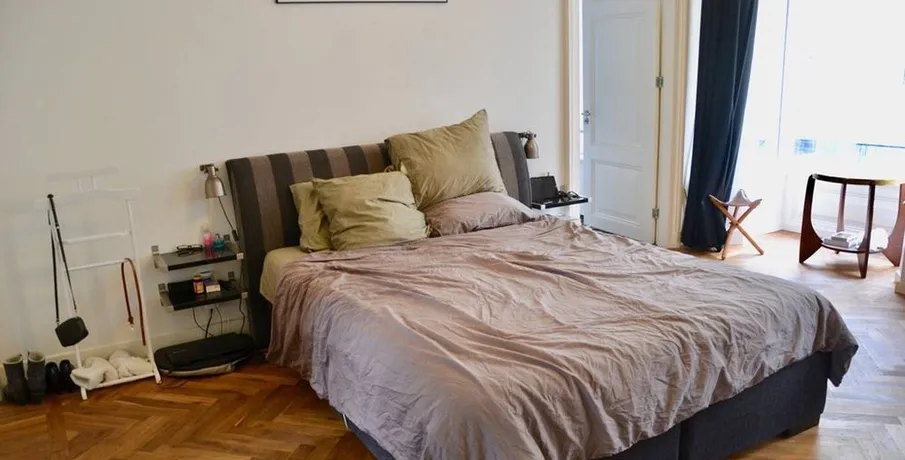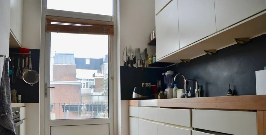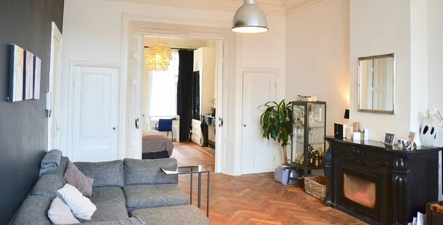 . Beschrijving. Chic and stately apartment in the historic Zeeheldenkwartier, with balcony and fully renovated with design elements. A unique apartment in the vibrant heart of The Hague. The apartment features beautiful fish bone parquet flooring, magnificent ornament ceilings and original details, original fire places, a modern kitchen fitted with all comforts and luxurious bathroom. The apartment comes with design furnishing, expansive windows and a sunny balcony.. Layout. Stairs to the first floor. Entrance into bright and warm living room with fire place, built-in cupboards, beautiful wooden 8-person dining table and comfortable L-couch. Kitchen window to the living room. Modern, design kitchen with white, elegant cabinets and ample storage space, matched with a wooden counter top and SMEG fridge. Built-in appliances including a stove, oven and dishwasher.. Sliding doors to the spacious bedroom with ensuite bathroom. Large wardrobes and built-in cupboard space, desk and high quality bed. Unique and cozy nook with large windows. Luxurious bathroom fitted with separate bath and walk-in rain shower, towel radiator, sink with storage drawers.. Wooden fish bone flooring, fully double glazed and centrally heated.. Located in the heart of the desired Zeeheldenkwartier. With tram 17 right in front of the door with direct lines to Duinoord/Statenkwartier (with OPCW, ICTY, Europol and Peace Palace) and the city center within a 5-10 minutes reach. The Zeeheldenkwartier is vibrant with many shops and restaurants located between the city centre and the Statenkwartier, the neighbourhood of the international organisations and embassies.. Key aspects. - Elegant and spacious apartment. - Balcony. - A-label. - Design apartment. - Renovated. - Excellent quality furniture. - Dishwasher. - Washing machine. - Nearby public transport. - Might be possible to move in earlier. Rental price: €2495,- excluding utilities - Furnished.