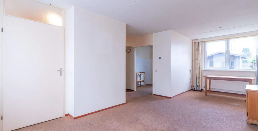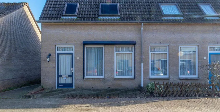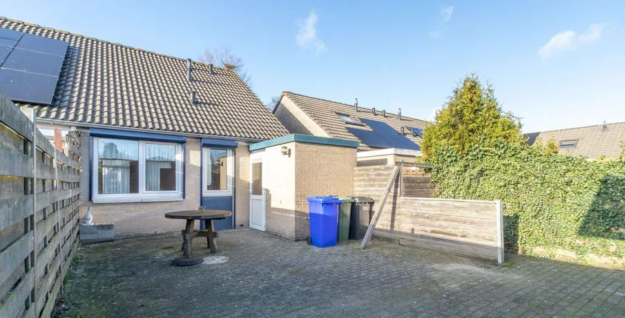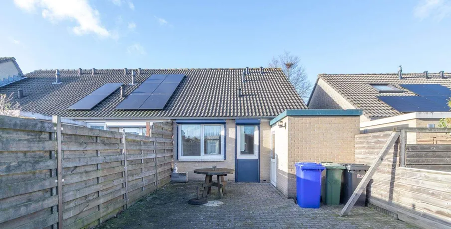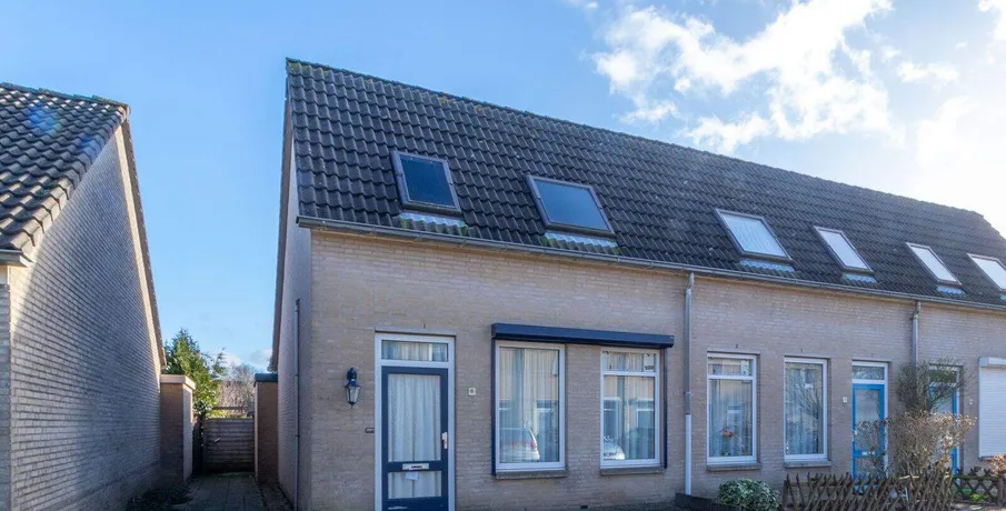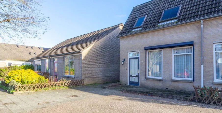 . Beschrijving. Gezellige geschakelde woning met uitbouw en een royale zonnige tuin, rustig gesitueerd aan een autoluw woonpleintje op 162 m2 eigen terrein. Voorzieningen zoals een bakker, slager en supermarkt bevinden zich op korte loopafstand! Gebouwd in 1988, met een inhoud van 230 m3 en 65 m2 woonruimte.. Indeling:. Entreehal met meterkast, toilet en trap naar de eerste verdieping, heldere woonkamer met hobbyhoek en toegang tot de gesloten keuken voorzien van een eenvoudig keukenblok met gaskookplaat en afzuigkap. In de uitbouw tref je de bijkeuken/berging met achterdeur die leidt naar de ruime, op het zuidoosten georiënteerde achtertuin met achterom en een groot tuinhuis met een vernieuwd dak.. 1e verdieping:. Overloop met opbergruimte, 1 grote slaapkamer met opbergkasten en een sobere badkamer met douche, wastafel, toilet en een wasmachineaansluiting.. Deze solide gebouwde woning is verder rondom voorzien van kunststof kozijnen met dubbele beglazing (behalve voor- en achterdeur (hardhout)), centrale verwarming (verouderde cv-ketel) en is volledig geïsoleerd. In 2000 is de woning volledig rolstoeltoegankelijk gemaakt!. Kortom, een zeer betaalbaar huis dat zeker een bezichtiging waard is!.