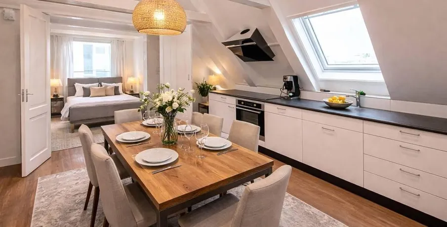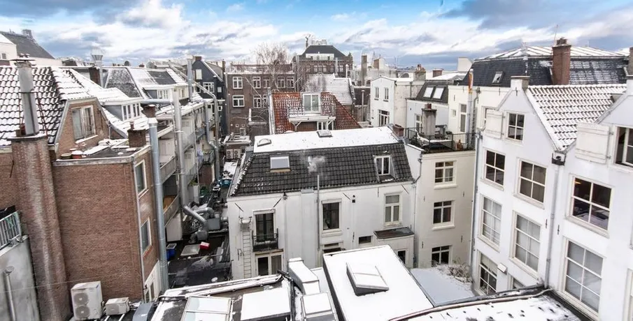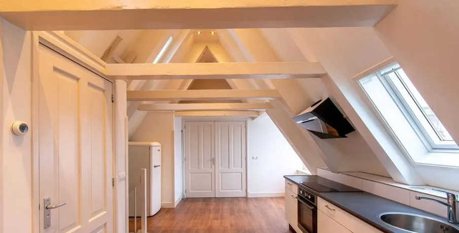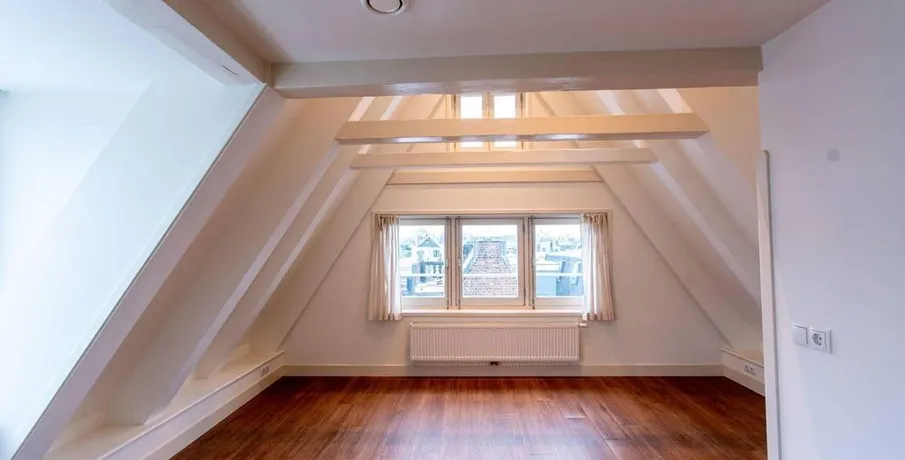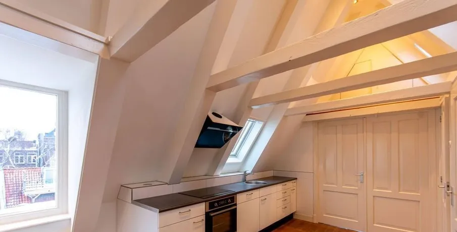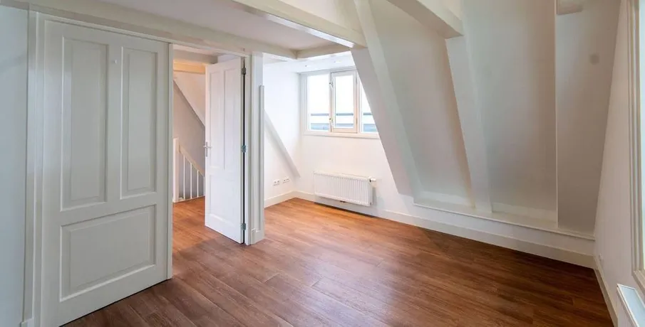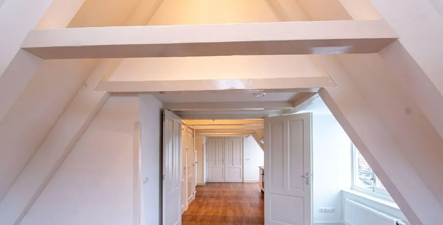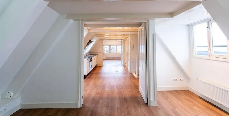 . Beschrijving. IntroductionThis very well-maintained, unfurnished three-room apartment is situated on the top floor (fifth floor, with entrance on the fourth floor) of a beautiful monumental building. As the apartment is located at the rear of the building, it offers a peaceful and quiet living environment despite its central location.Apartment LayoutThe entrance to the apartment is on the fourth floor (pleas....