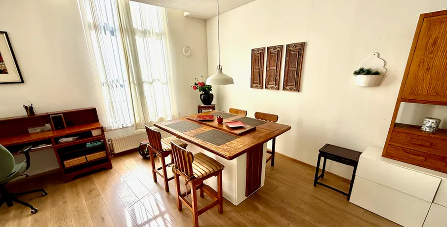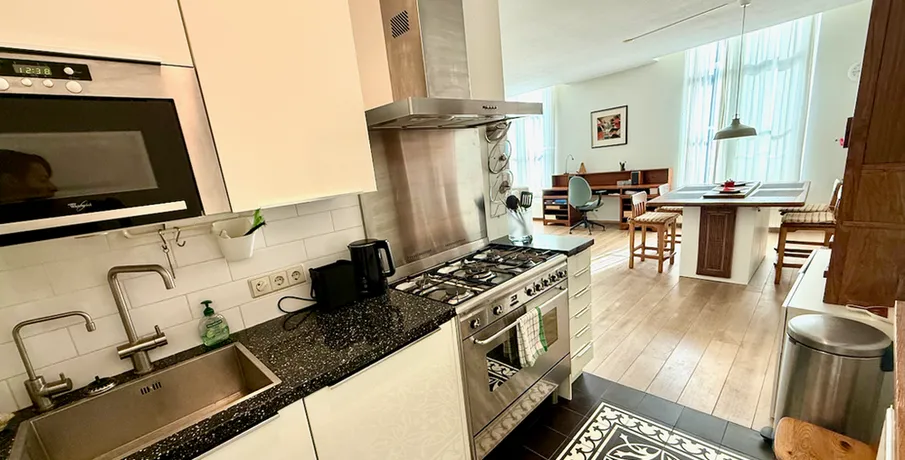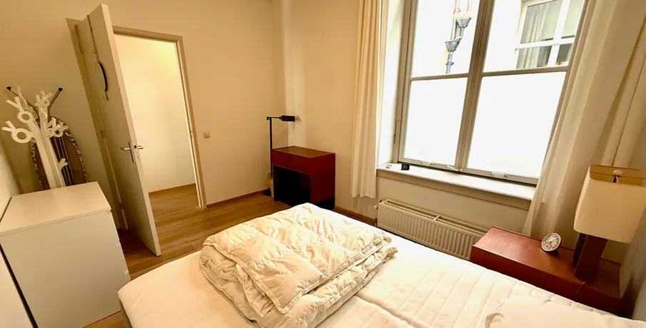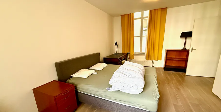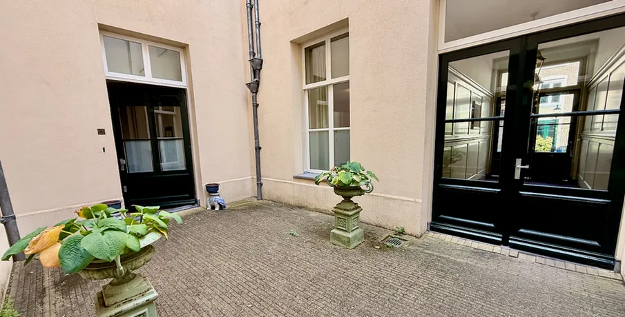 . Beschrijving. Beautiful two bedrooms apartment on the ground floor in the city-centre. This apartment is in the historic "Amicitia" building, and features large classic windows and light wooden flooring throughout. Modernly decorated kitchen with all appliances and high end furniture. The complex also features a spacious and luxurious communal garden, as well as bicycle storage and garage.LayoutThe....
