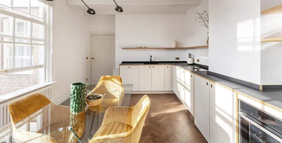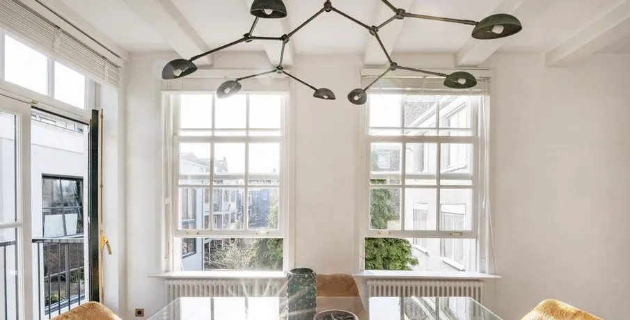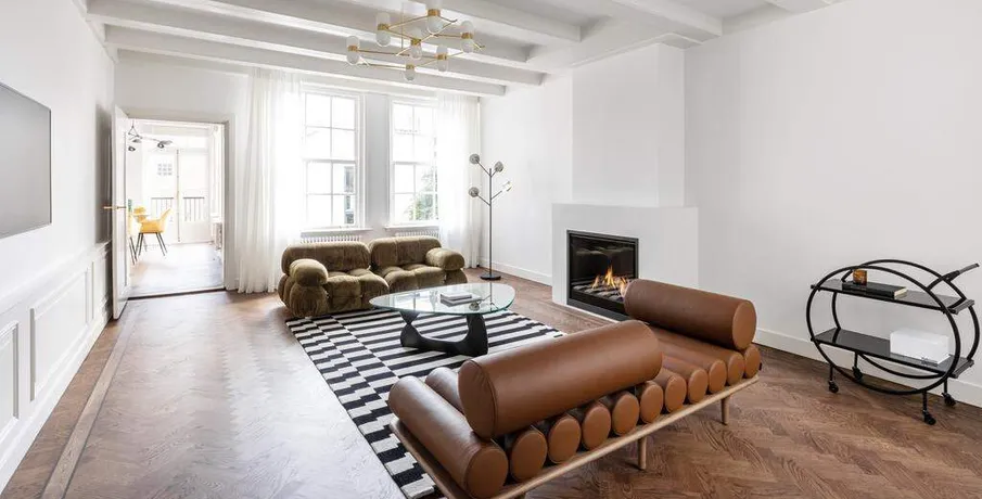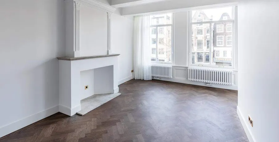 . Beautifully renovated and stylishly furnished 3-room apartment of 108 m2 with a balcony, located in the heart of Amsterdam.. This historic building dates back to 1663 and is situated in the centre of the Jordaan. The property features two bedrooms, a bathroom, ample storage space, and a spacious living room connected to an open-plan kitchen and adjoining balcony.. The communal entrance leads to the hallway on the first floor. From here, all rooms, including the living room, kitchen, bathroom, and two generous bedrooms, are easily accessible. The living room, situated at the apartment’s rear, flows into the kitchen, both bathed in natural light. The kitchen is equipped with high-end appliances and offers convenient access to a rear balcony. Positioned at the apartment’s front, you’ll find the two spacious bedrooms with exquisite dark wooden herringbone floors, along with a stylish bathroom complete with a bathtub, double sink, and walk-in shower.. Features:. – Living area of 108 m² (in accordance with NEN2580);. – Two generous bedrooms;. – High-quality renovation;. – Stylishly furnished;. – Luxuriously finished bathroom with bathtub and shower;. – Dark wood herringbone flooring;. – Separate toilet;. – Available from mid-November.. Not suitable for sharers. Guarantors will not be accepted.. Read more. Hide. DUTCH. ENGLISH.