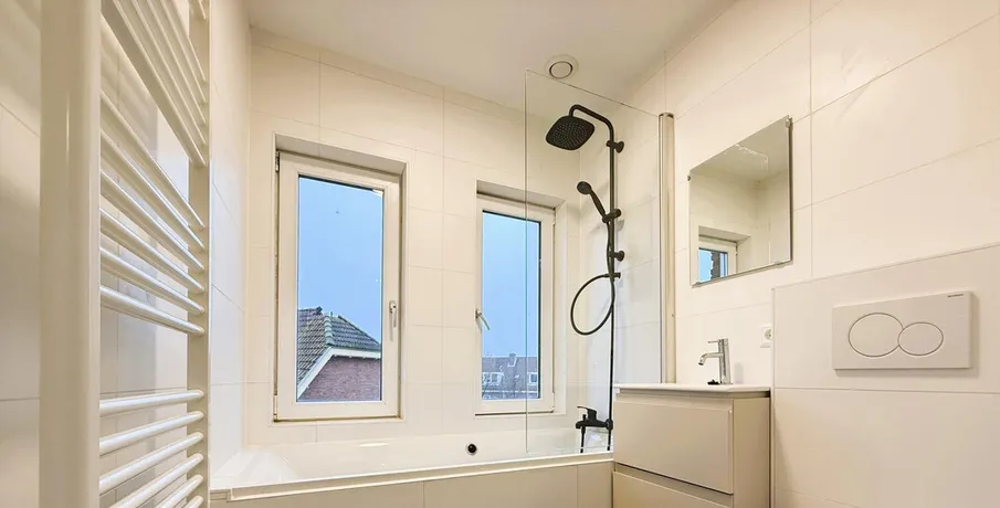 . Gelegen op een zeer centrale locatie in Amsterdam Noord, op steenworp afstand van de pont naar het centrum en het metro station Noorderpark vind je deze fraaie volledig gerenoveerde dubbele bovenwoning voorzien van 2 slaapkamers.. Indeling: Privé entree aan de achterzijde van het pand, op de begane grond. Trap naar de eerste etage. Hal die toegang biedt tot de ruime en lichte woonkamer met moderne semi-open keuken. De keuken is voorzien van een koelkast, vriezer, combi-oven/magnetron, vaatwasser en inductiekookplaat met afzuigkap. Op deze etage vind je tevens een separate toiletruimte. Vanuit de hal trap naar boven waar de zeer grote ouderslaapkamer te vinden is en een kleinere tweede slaapkamer. Moderne badkamer met douche/bad, wastafel, tweede toilet en designradiator. Er is een aparte ruimte aanwezig voor het plaatsen van een wasmachine en droger. Het gehele appartement is voorzien van een fraaie en lichte PVC vloer en raambekleding.. In de directe omgeving vind je diverse winkels, supermarkten en eetgelegenheden.. Kortom, een mooie gerenoveerde woning die beschikbaar is voor de langere termijn.. ------------------------------------------------------------------------------------------------------------------------------------------------------------------------------------------. Located in a very central location in Amsterdam North, a stone's throw from the ferry to the city center and the Noorderpark metro station, you will find this beautiful, fully renovated double upper apartment with 2 bedrooms.. Layout: Private entrance at the rear of the building, on the ground floor. Stairs to the first floor. Hallway leading to the spacious and bright living room with modern semi-open kitchen. The kitchen is equipped with a refrigerator, freezer, combi-oven/microwave, dishwasher, and induction hob with extractor hood. There is also a separate toilet on this floor. From the hall, stairs lead upstairs to the very large master bedroom and a smaller second bedroom. Modern bathroom with shower/bathtub, sink, second toilet, and designer radiator. There is a separate space for a washing machine and dryer. The entire apartment has beautiful and light PVC flooring and window coverings.. In the immediate vicinity, you will find a variety of shops, grocery stores and restaurants.. In short, a beautifully renovated home that is available for long-term rental..