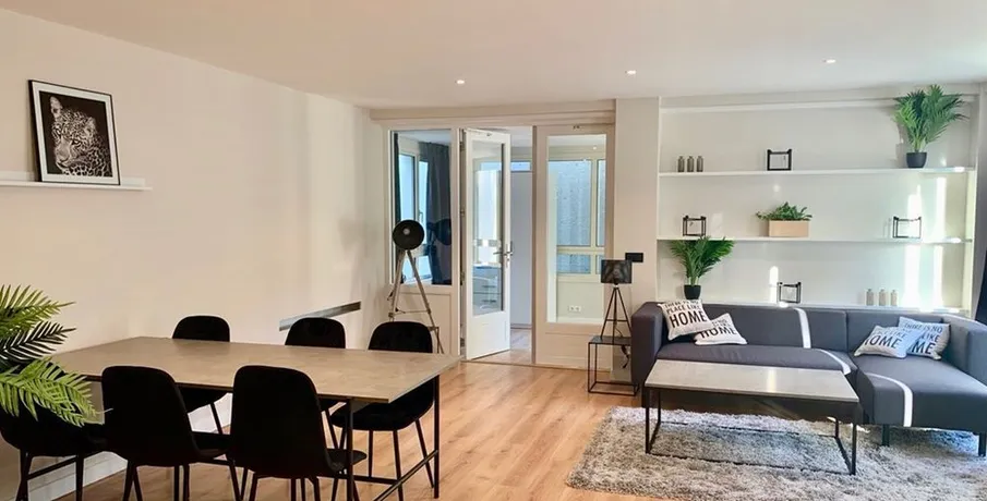 . Beschrijving. Recently renovated and fully furnished turn-key home with 3 bedrooms on the groundfloor with garden at Nieuwe Parklaan. This luxurious home is approx. 95m2 and has a fully renewed Bauknecht kitchen, smart light system, state of the art bathroom and tastefully selected furniture. On top of these great features an indoor parking spot is provided as well. The garden is approx. 60m2 and on the sunny side of the building. Living at Nieuwe Parklaan is living close to the beach as well as various embassies and International Organisations. Tramlines before the house.. Layout. Shared entrance from the street. Hallway on ground floor to the apartment. Entrance in hallway with doors to all rooms. Spacious and bright living room with modern open kitchen with appliances such as dishwasher, separate freezer and fridge, sink, oven / microwave, induction stove and ample storage space. 3 spacious bedrooms all with wardrobes and comfortable beds. Bathroom with bath, walk-in shower and sink. Separate room for the washing machine and dryer. Toilet with faucet. Laminate flooring, centrally heated and fully double glazed.. Location. Located in the chique part of Scheveningen. Just a stones throw from the most popular beach in the Netherlands, boulevard, pier, bars and casino's. But also in the near vicinity of the dunes and parks. This location gives direct entrance to the center of the city (15 minutes by public transport) and is even closer to the French and German school, Europol, various embassies, ICTY and others.. Key aspects. - Fully renovated. - Turn-key home. - Design furniture. - New kitchen. - Public transport connections in front of the building. - Scheveningen beach, boulevard and bars. - Private parking. Rental price: €2795,- excluding utilities - Furnished.